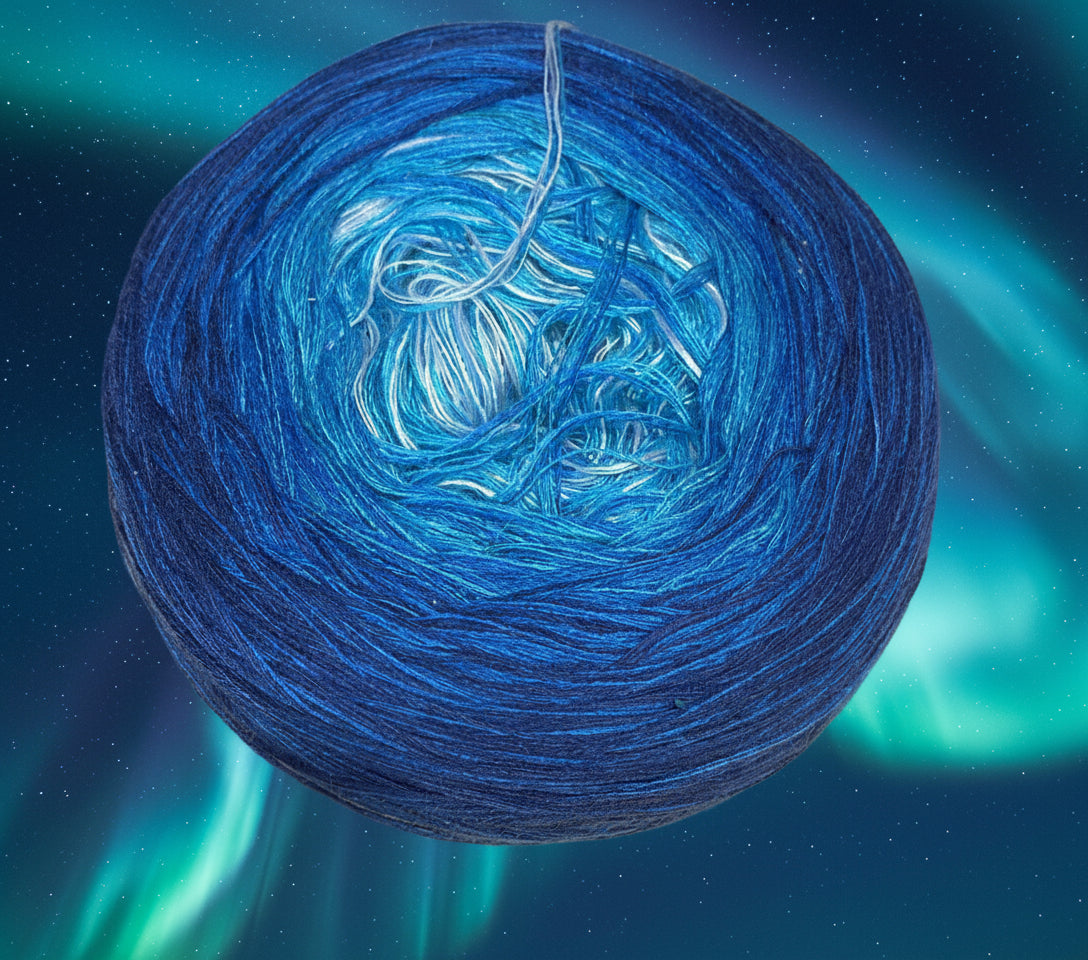 Wie ein Hauch arktischer Frische entfaltet sich „Polarlicht“ in einem sanften Farbverlauf von tiefen Blautönen bis hin zu klarem Weiß. Dieses Garn erinnert an das faszinierende Leuchten des Nordlichts am Himmel – kühl, ruhig und zugleich magisch.