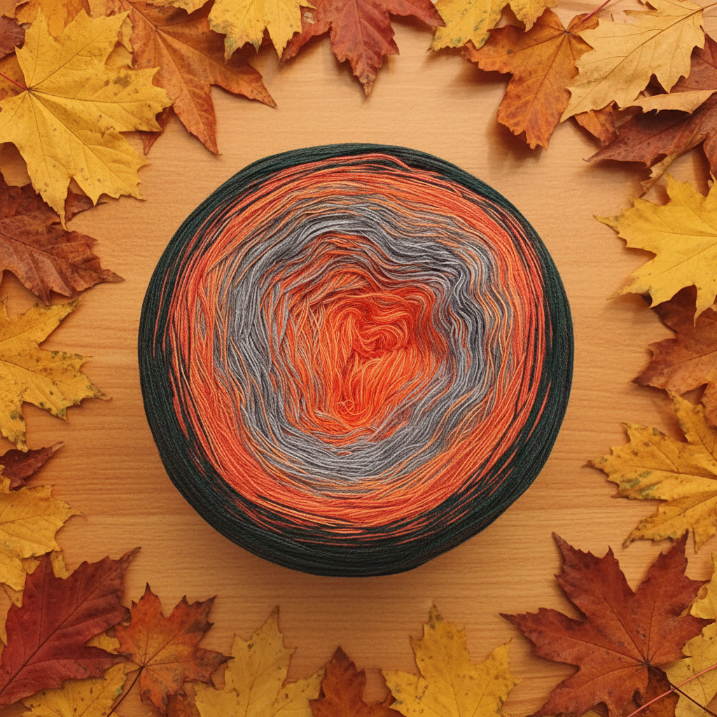 Entdecke einen warmen, natürlichen Farbverlauf, der tiefes Grün über satte Orange-Töne bis hin zu sanftem Grau führt. Das 4-fädige Garn verbindet Festigkeit und Geschmeidigkeit, ideal für etwaige Kleidungsstücke, Accessoires und dekorative Projekte. Die harmonische Abstufung ergibt beim Stricken oder Häkeln lebendige Muster mit ruhiger Tiefe.