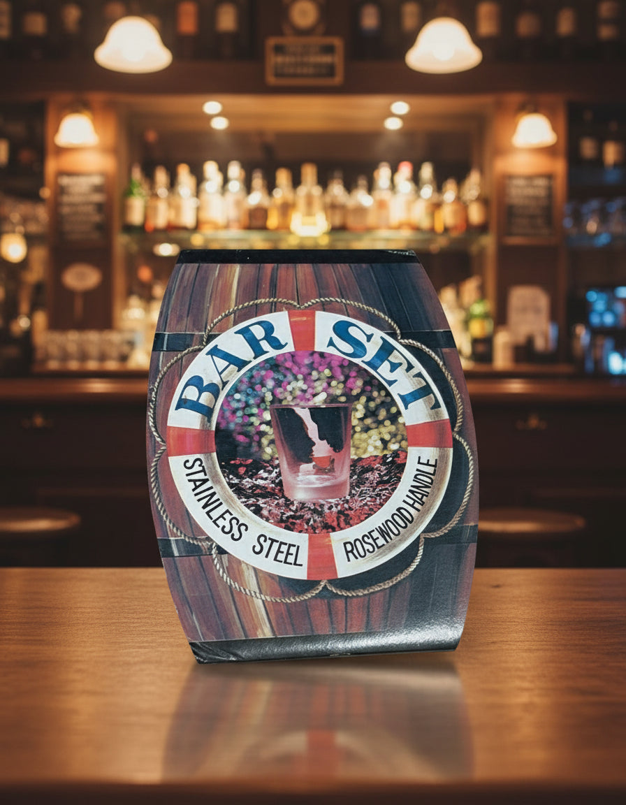 Ein hochwertiges Bar-Set von Zassenhaus mit stilvollem Holzuntersetzer, professionellen Barwerkzeugen und praktischer Aufbewahrung. Perfekt für Zuhause oder als Geschenk. Enthält typischerweise Effecktaschen für Shaker, Jigger, Barsieb, Rührlöffel und Zangen, alles aus langlebigen Materialien mit klassischem Design.