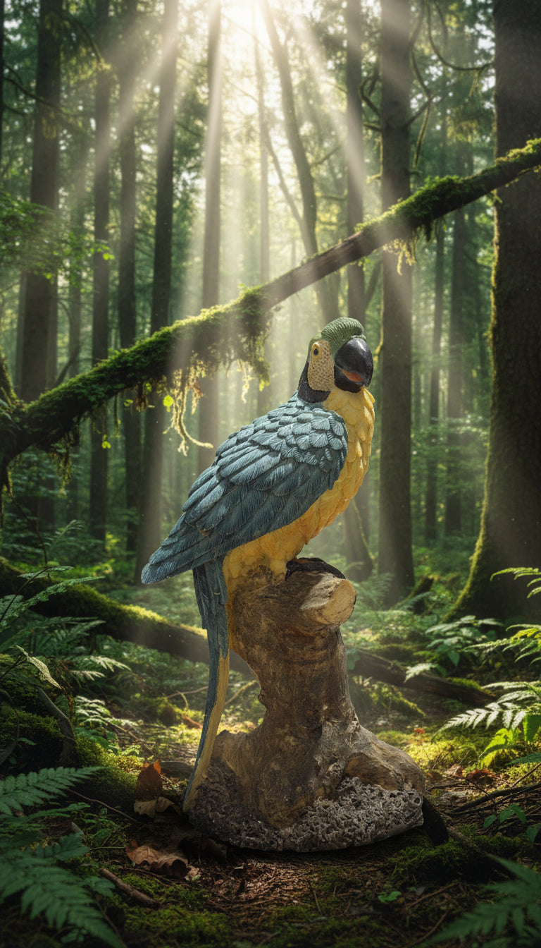 Blaue Papagei-Figur auf einem Stamm, ca. 30 cm hoch. Die Figur zeigt einen stilisierten Papagei mit lebhaften Blau- und Türkistönen, feinen Federstrukturen und einem stabilen Stamm als Basis. Ideal für das Sideboard, die Vitrine oder das Arbeitszimmer – ein farbiger Blickfang mit moderner Silhouette.