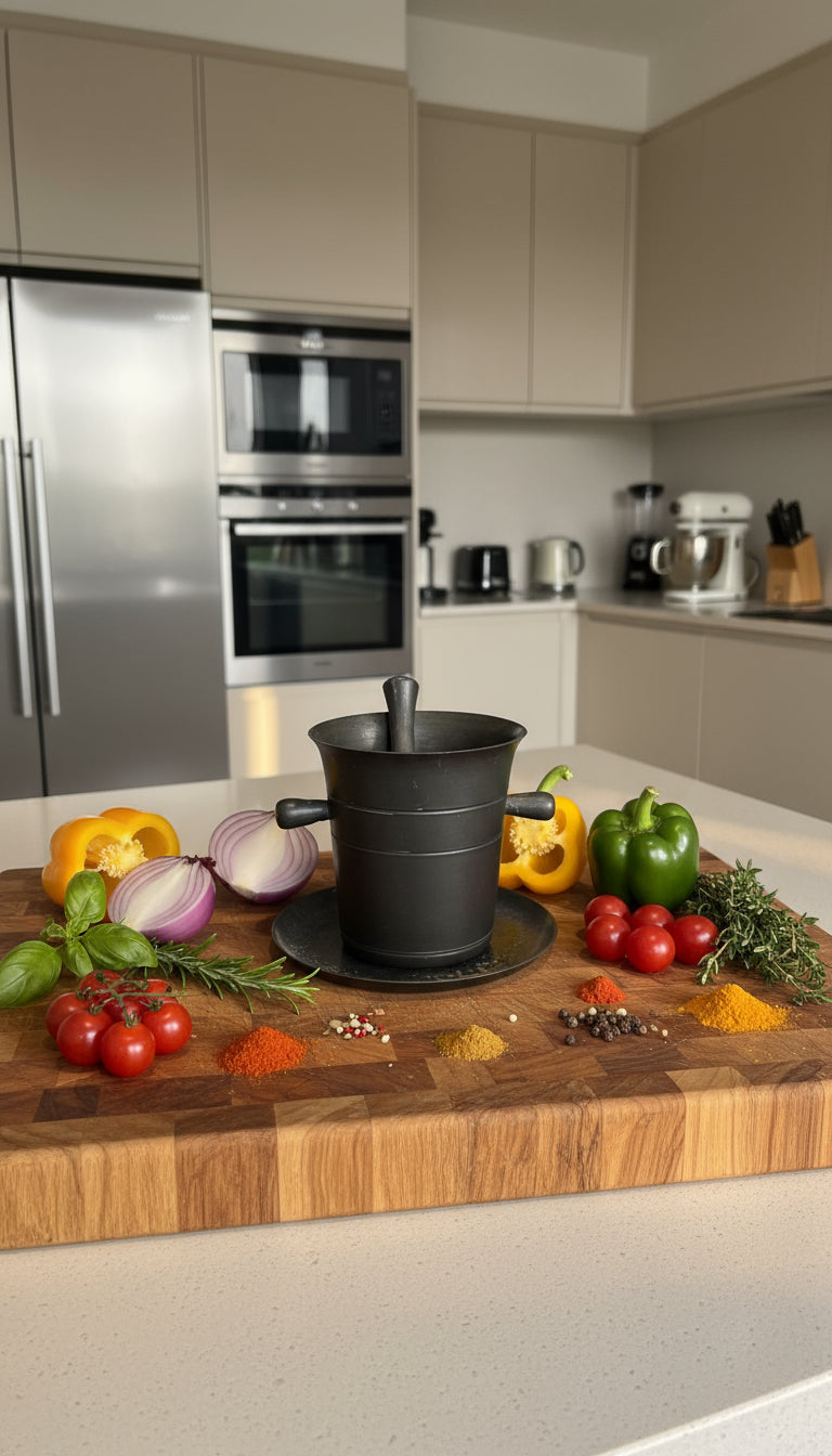 Mörser mit Stößel und Unterteller ca. 7,5 cm. Kompakter, dekorativer Mörser-Set im Vintage/Rustik-Style. Robuste Metallkonstruktion mit passendem Stößel und Unterteller, ideal als Ziergefäß oder dekoratives Kochaccessoire. Leicht zu reinigen und langlebig, ideal als dekoratives Kochaccessoire oder Sammlerobjekt.