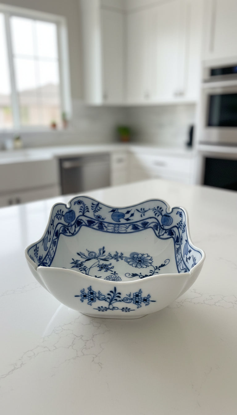 Kleine Porzellanschüssel mit klassischem Zwiebelmuster. Ideal als dekoratives Element für Vitrine, Esstisch oder Nachtischschränkchen. Fein gearbeitet, filigrane Musterung und elegante Farbgebung bringen historischen Charme in jeden Raum.