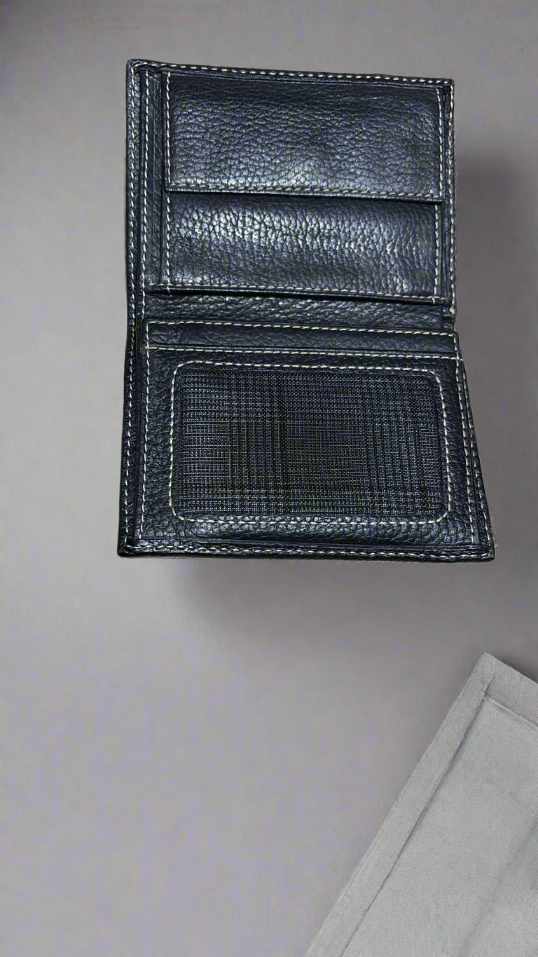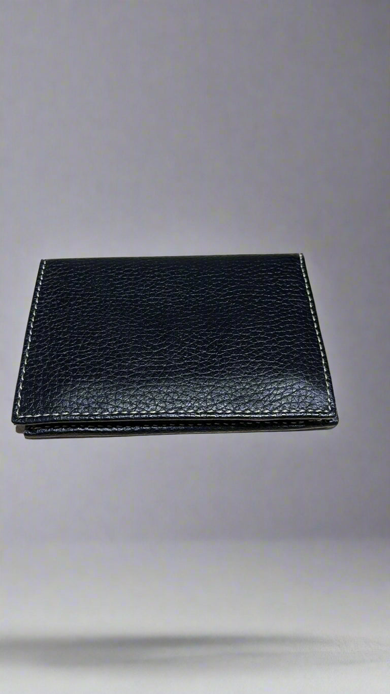 Dieser schwarze Geldbeutel verfügt über eine sichtbare Naht, die als Designelement betont wird. Er ist kompakt und funktional gestaltet, geeignet zur sicheren Aufbewahrung von Bargeld und Karten.